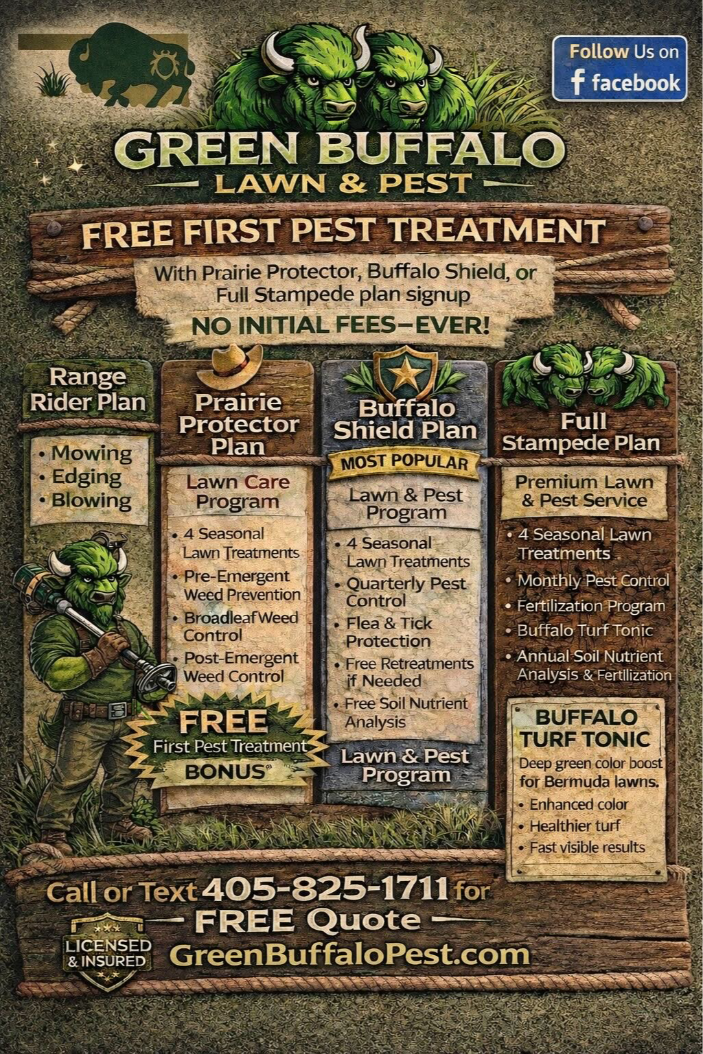 Buffalo Shield Plan - seasonal lawn treatments, quarterly pest control, flea & tick protection, soil nutrient analysis